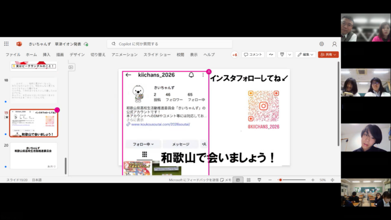 11月4日と11月11日の2日に渡り、「きいちゃんず」オンライン会議を行いました。11月16日に行われる滋賀県主催のカウントダウンイベントでの発表に向けて、teamsを用いて議論をしながらスライド編集を行いました。発表スライド・原稿も仕上がり、あとは発表本番に向けて練習あるのみ!!ガンバレきいちゃんず!!