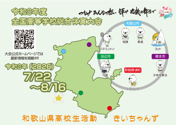 和歌山県高校生活動推進委員会第2回総会で推進委員会の愛称が「きいちゃんず」に決定し、イオンモール和歌山において、初めての広報活動を行います。「ささえる」立場の和歌山県高校生活動推進委員が自ら企画・運営し、令和8年度全国高等学校総合体育大会開催に向けて、PRをします。